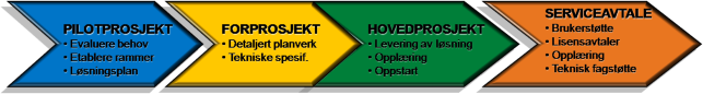 For- og hovedprosjekt er en samlet løsning i to trinn. Forprosjektet kultiverer innhold og rammer fra pilotprosjektet. Resultatet fra forprosjektet danner grunnlaget for gjennomføringen i hovedprosjektet.